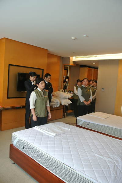 比賽以抽簽的形式確定參賽員工比賽的先后順序,大家各自準備好比賽布草后,比賽正式開始。參賽員工兩個人為一組進行比賽,選手既緊張又興奮,大家都拿出了自己的看家本領,在比賽過程中,參賽員工你追我趕、熱火朝天,參賽評委認真測評,仔細打分。